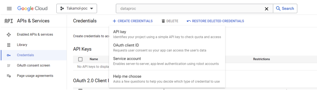 - If prompted, set up the consent screen. Here, you need to add scopes to grant full access to all GCP services (including Dataproc): add the https://www.googleapis.com/auth/cloud-platform scope.